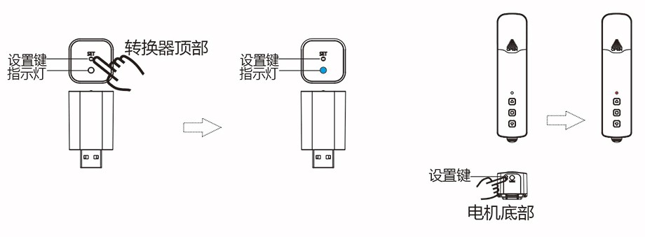 ◆點按轉(zhuǎn)換器【設(shè)置鍵】,當(dāng)轉(zhuǎn)換器【指示燈】藍(lán)色快閃后,連續(xù)點按電機(jī)【設(shè)置鍵】兩次,電機(jī)【指示燈】紅色慢閃;