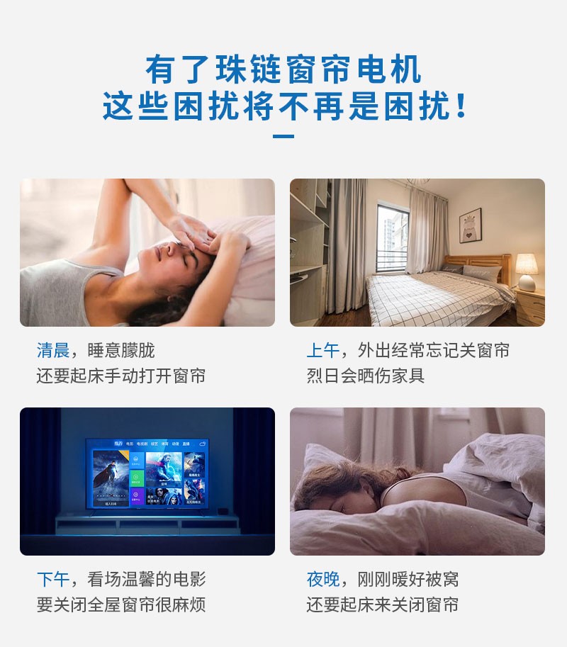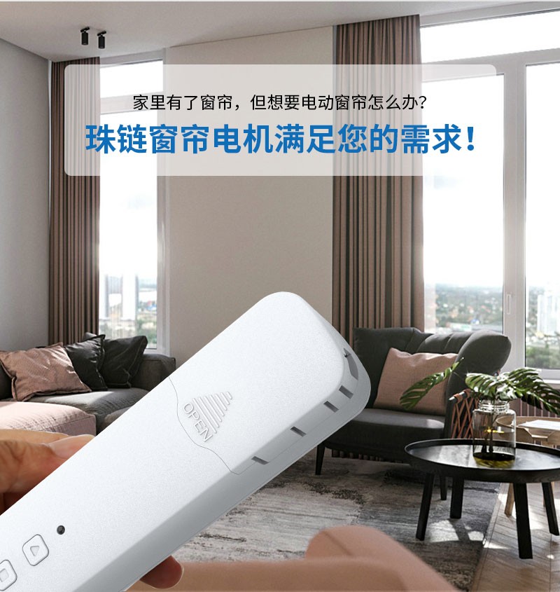此產(chǎn)品適用于拉珠卷簾,可以把傳統(tǒng)的拉珠卷簾改變?yōu)橹悄茈妱哟昂?,安裝簡單,操作方便。安裝后可通過遙控器、語音、手機(jī)APP等控制窗簾升降。